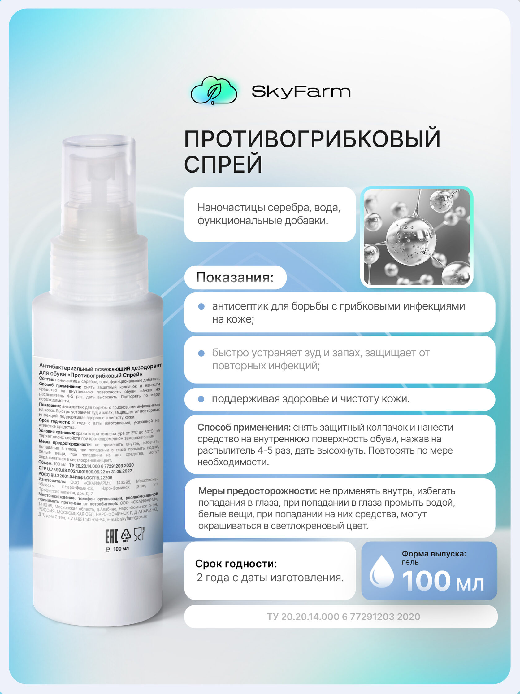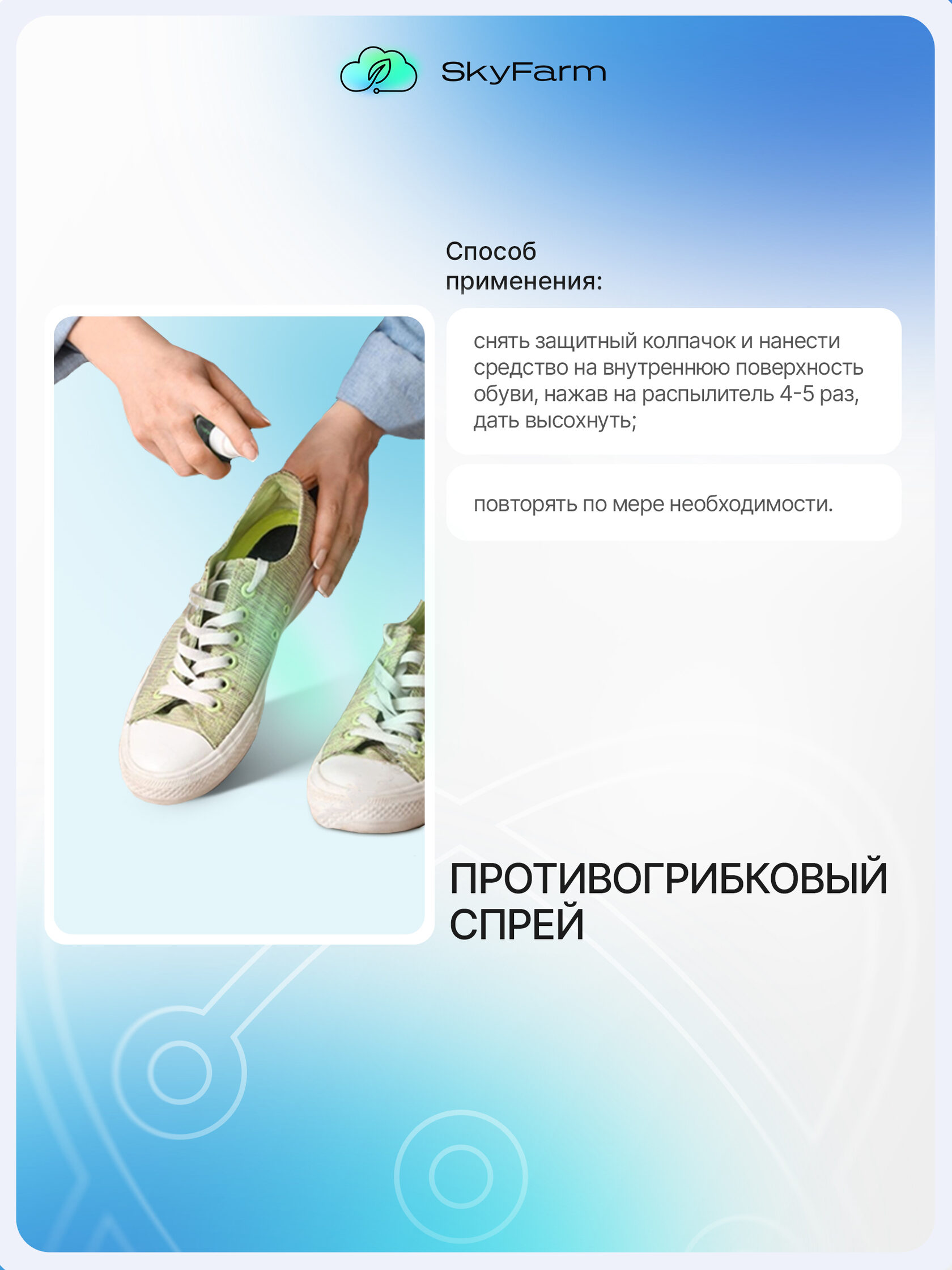 Противогрибковый спрей Предотвращает развитие грибковых инфекций, особенно в зонах с повышенной влажностью.